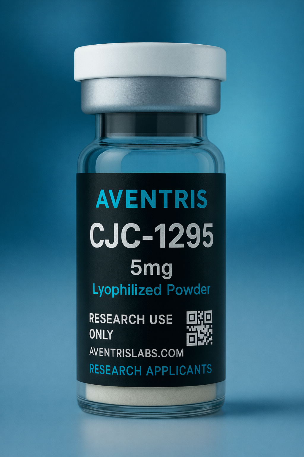 CJC-1295 (No DAC) lyophilized powder in sealed glass vial with batch-specific labeling and QR verification code.
